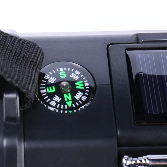Denna robusta nödradion har en inbyggd powerbank och kan laddas via den inbyggda veven, solpanelen eller via USB-uttaget.