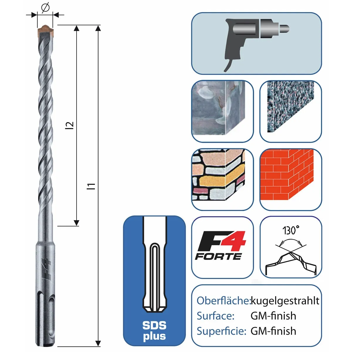 - F4 Forte är en SDS-plus slagborr med hög prestanda, som har 2 skärande hårdmetallblad och patenterad "4-step"-dubbelgängad profil