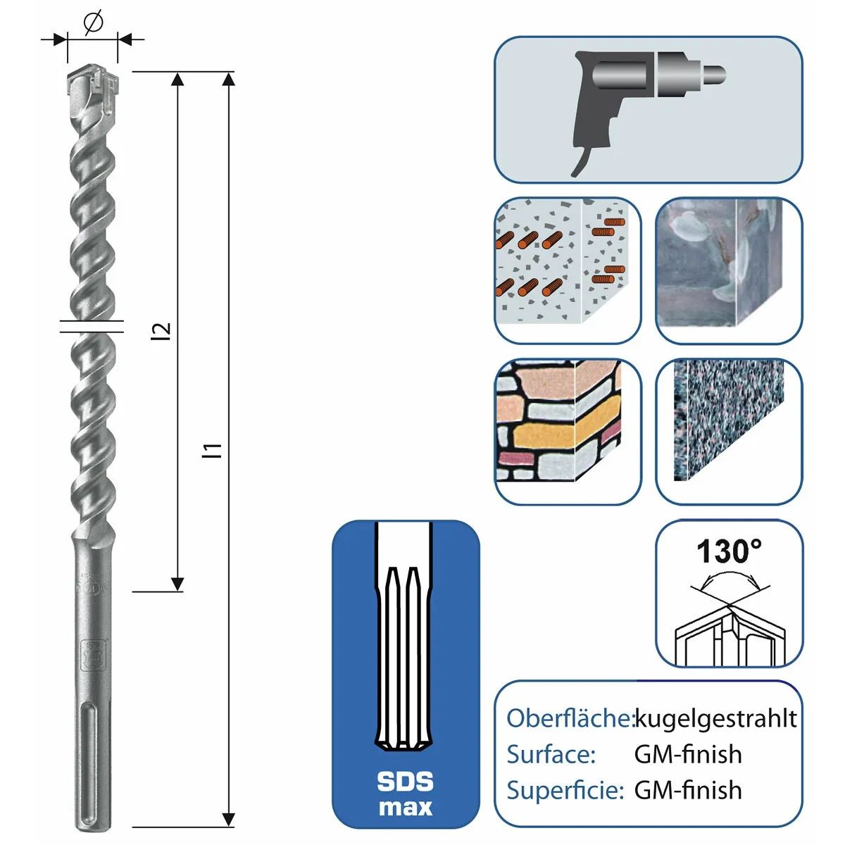 - SDS-max slagborr med mycket hög prestanda, lämpar sig särskilt för slagborrning i betong, natursten och murade sten- och tegelkonstruktioner