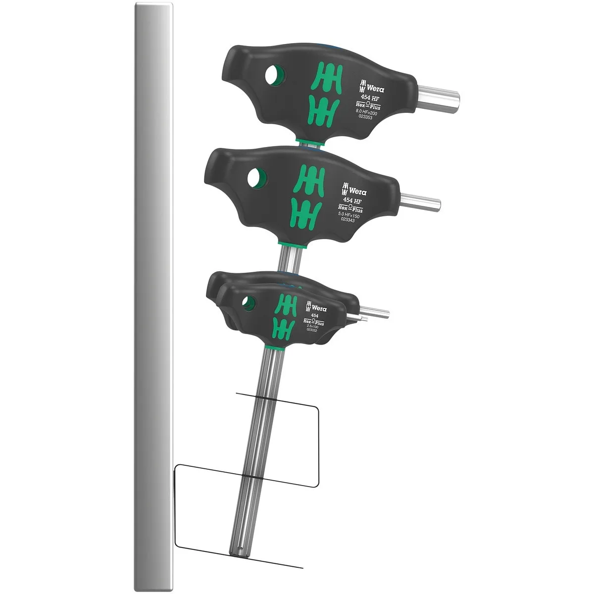 - Med hållarfunktion på den långa skänkeln för säker fixering av skruven på verktyget (>= 3 mm)
