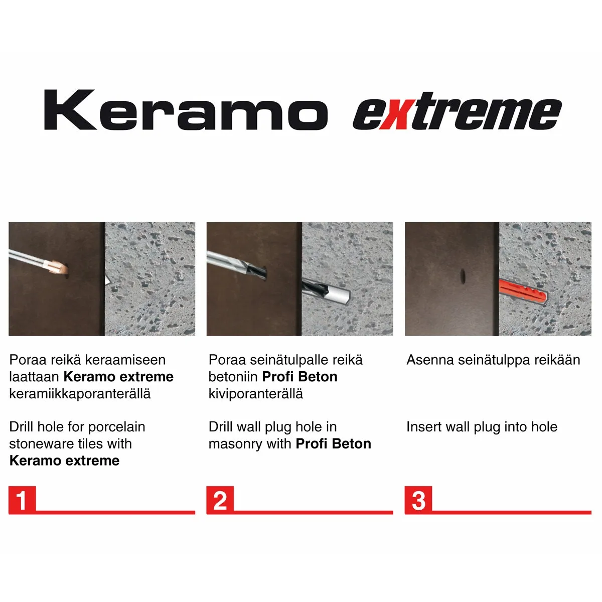 - Keramo Extreme är en kakelborr för extremt hårda keramiska plattor (upp till 9 på Mohs-skalan) samt för glas och porslin