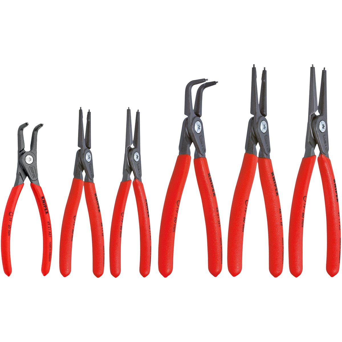 - 6 delars Knipex låsringstångsats, för både invändiga och utvändiga spårringar- låsringstång med raka spetsar Ø 12 - 25 mm för invändiga låsringar (4811J1)- låsringstång med raka spetsar Ø 19 - 60 mm för invändiga låsringar (4811J2)