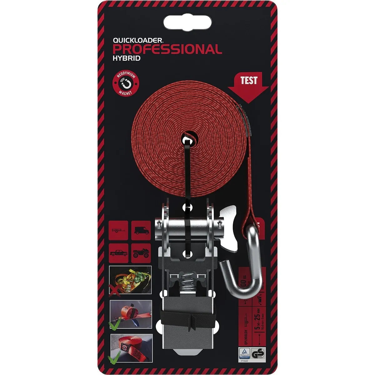 - QUICKLOADER® Professional Hybrid QPL900LDH är en förbättrad version av det traditionella tvådelade spännbandet: en magnet för att hålla bandet upprullat under förvaring och ett elastiskt band för att hålla bandet förknippat under transport