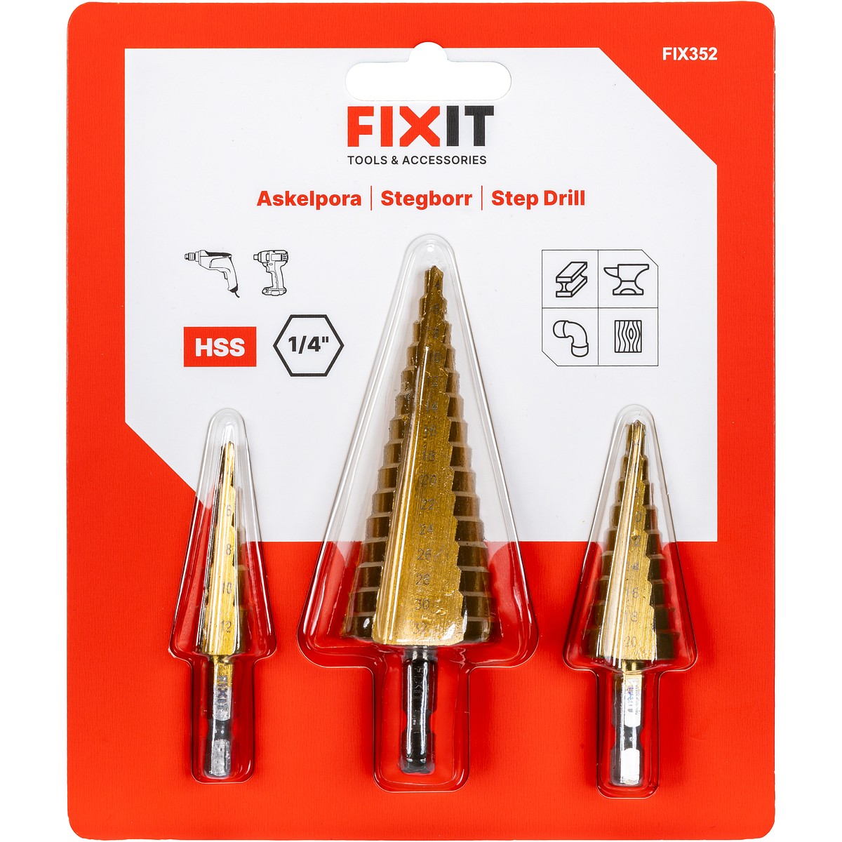 - För borrning av flera håldiametrar med ett och samma borr i stål, mässing, koppar, aluminium, trä och plast