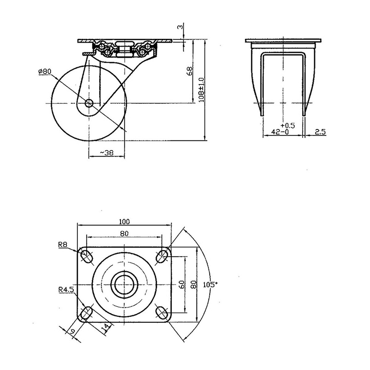 - svängbart, glidlagrat transporthjul- fästplatta, gaffel och fälg i galvaniserat stål- gummihjul med god slit- och stöttålighet