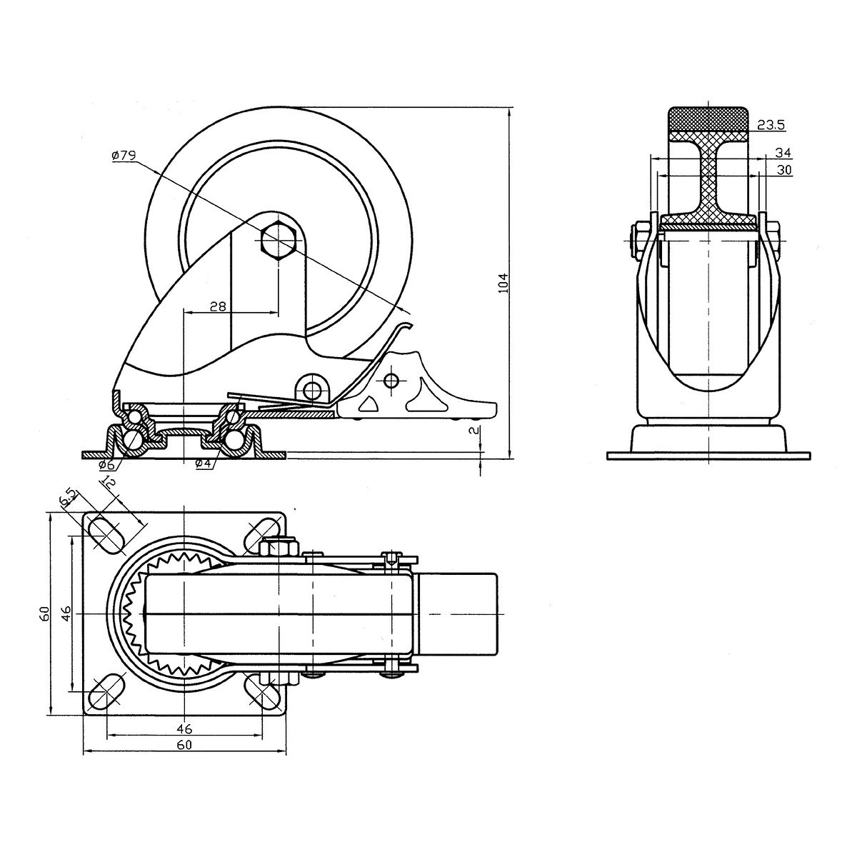 - dubbelglidlagrat svänghjul med dubbelbroms- fästplatta och gaffel i galvaniserat stål- hjulets material termoplastisk gummi