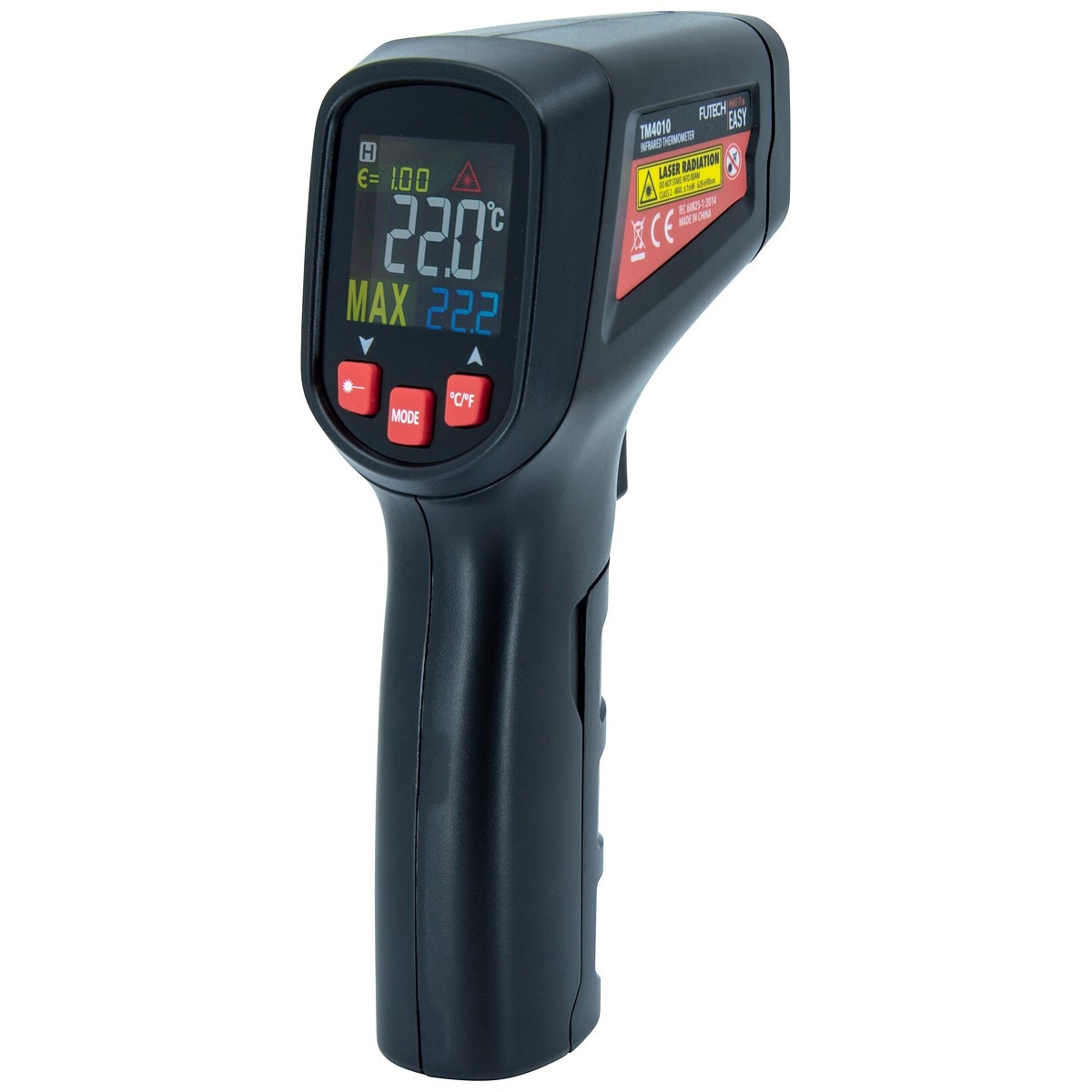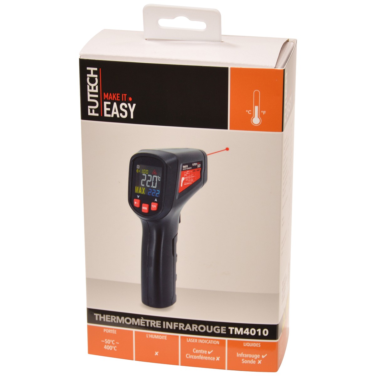- Futech TM4010- Infraröd termometer för kontaktlös mätning av temperaturen på (farliga, rörliga) ytor mellan -50°C och +400°C med en noggrannhet på 1,5%Tekniska data: