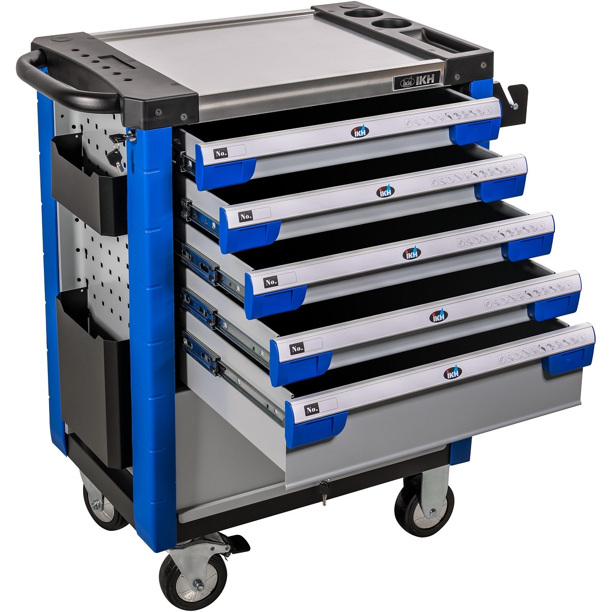 - Stadig verktygsvagn i stål- Fem lådor på glidskenor, låsbart förvaringsutrymme i botten- Två fasta hjul och två svängbara hjul med broms